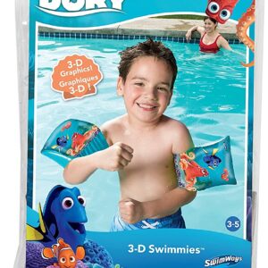 Disney Finding Dory 3-D Swimmies are inflatable arm floats from SwimWays.;Two-layered 3-D graphics bring charcters from Finding Dory to life!;Dual air chambers and safety valves for added security.;Two water wings per pack.;Ages 3-5.